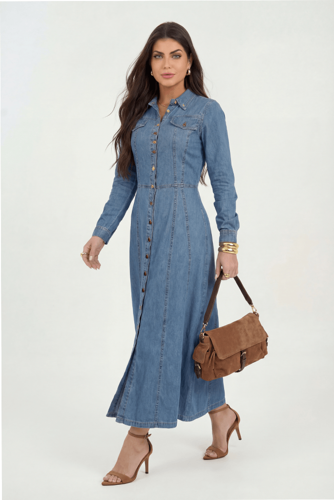 Para as apaixonadas por jeans, esse vestido é uma joia. A gola diferenciada adiciona personalidade ao clássico vestido chemise, enquanto a saia godê traz feminilidade e movimento. O jeans, além de versátil, é uma peça que nunca sai de moda, e nesse modelo ele ganha um toque especial, podendo ser usado em diversas ocasiões, do casual ao semi-formal. Combine com tênis branco para um look moderno ou com botas para um visual mais ousado.