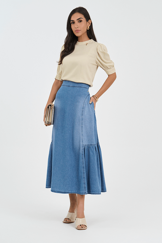 Cada peça foi desenvolvida com altos padrões e qualidade têxtil, trazendo o tecido jeans com um toque mais leve. Dessa forma, você consegue montar looks com saia jeans para diversas ocasiões, a altura midi fica perfeita tanto com um tênis para momentos descontraídos quanto com scarpin para os compromissos da igreja.