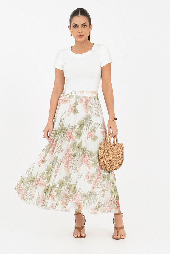 Nossos modelos de saias midi plissadas são confeccionados em tecido leve, como o chiffon acetinado ou tecido plano com detalhes em poá levemente texturizado, oferecendo um ótimo caimento à peça.