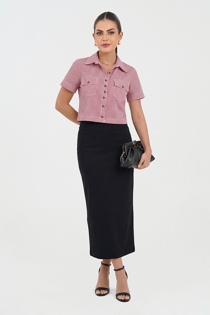 Tem uma apresentação importante? A saia reta vai te dar aquele ar de confiança que você precisa! Escolha uma blusa que combine com seu estilo e mostre que você está no controle.